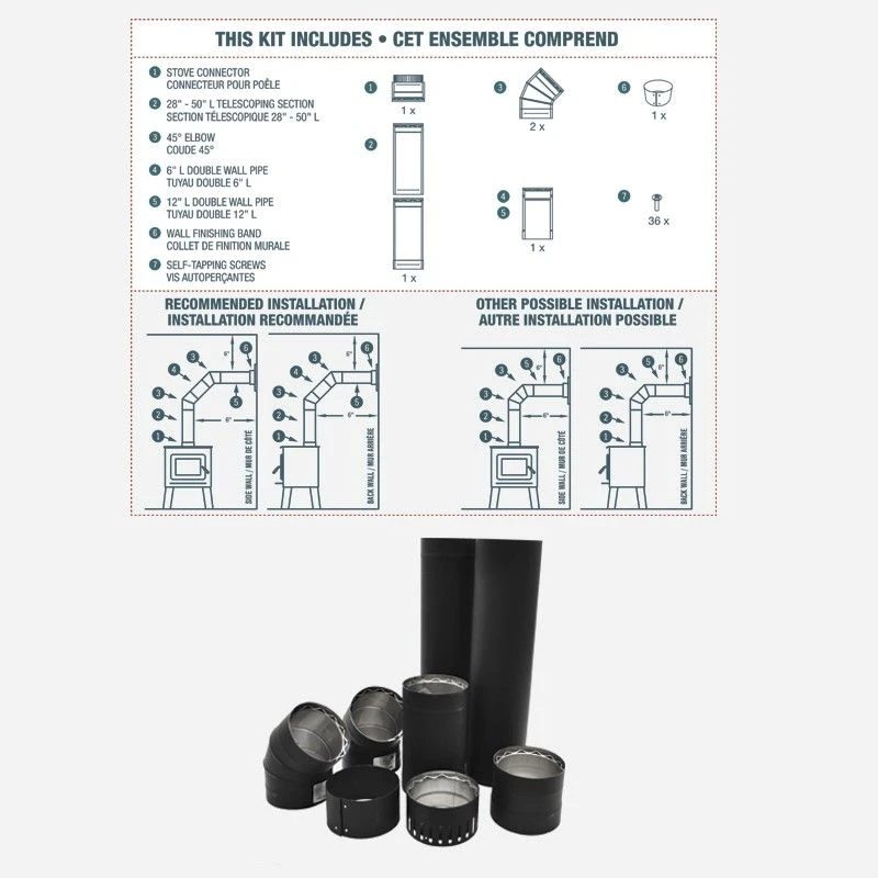 1x appliance connector, 1x double wall pipe 6″ length, 1x double wall pipe 12″ length, 1x telescoping section 28″ to 50″, 2x 45° elbows, 1x wall finishing band and 36x self tapping screws.