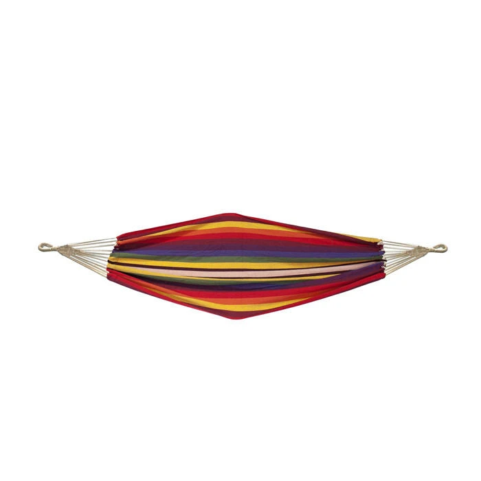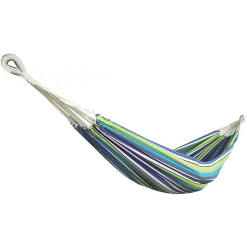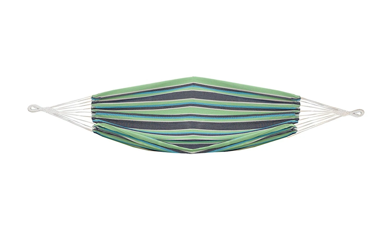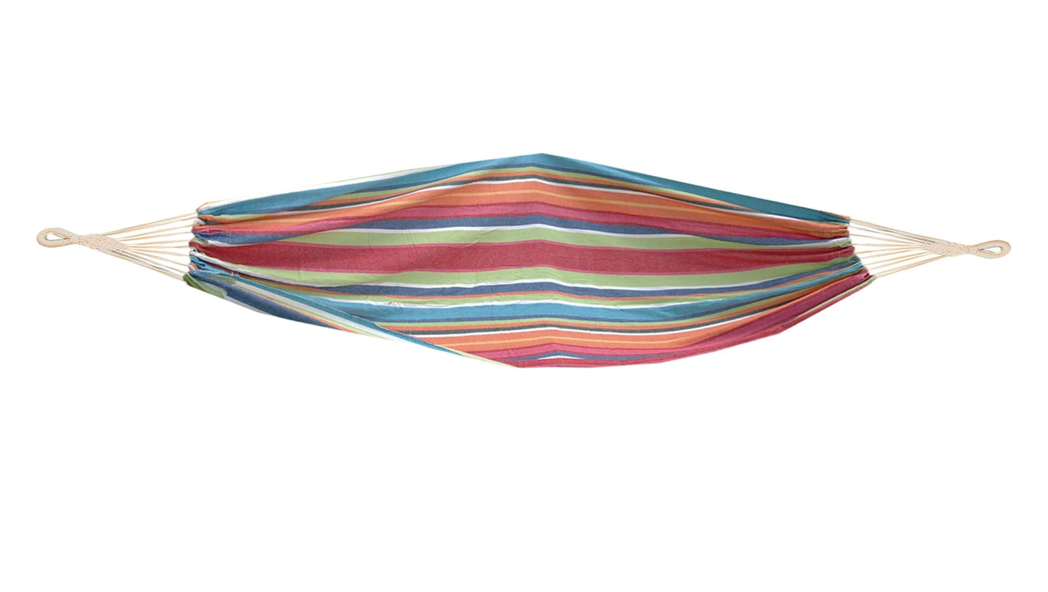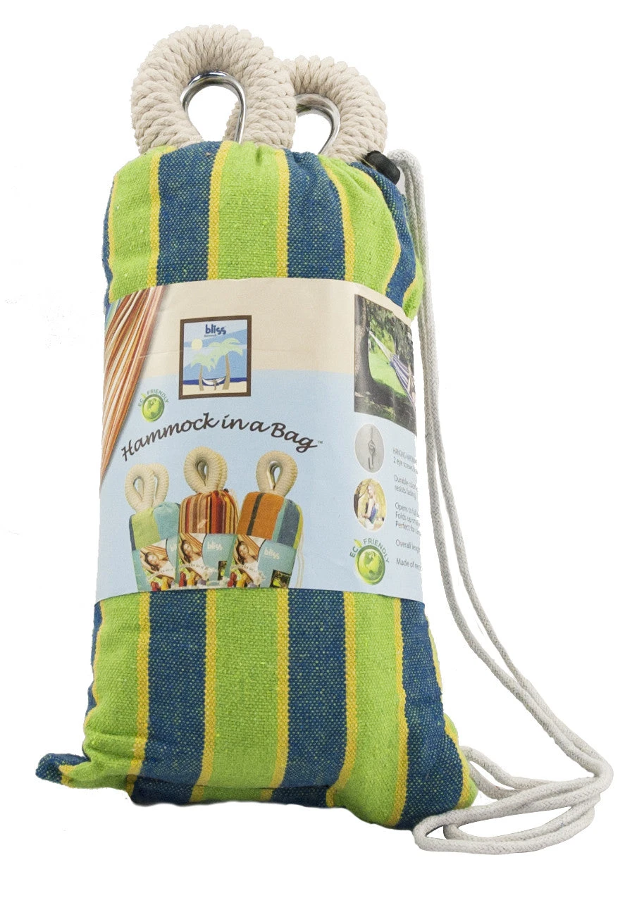 This versatile full size Brazilian style hammock brings together tradition And comfort with sensitivity to the environment. A blend of Eco- friendly recycled polyester And cotton fabrics gives you the durability you need to last through the seasons ahead. Reinforced steel Hammock loops for durability. The Hammock in a Bag is also great for indoor use. Just hang the hammock in the corner of your room or hang the two ends from the ceiling And use it as a hammock chair! Elegant And colorful stripe selections give this hammock the perfect touch. All Bliss Hammocks ropes are made from strong eco-friendly recycled materials.
