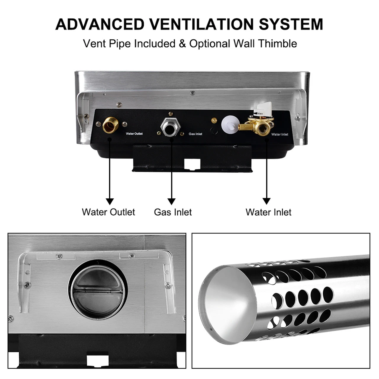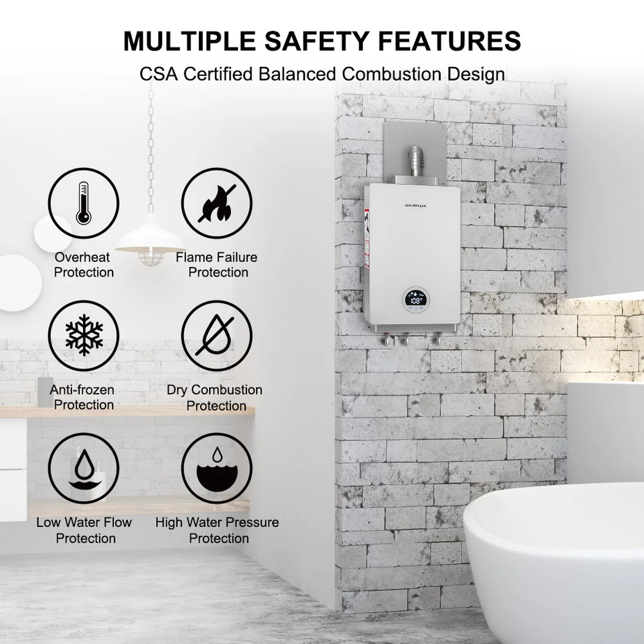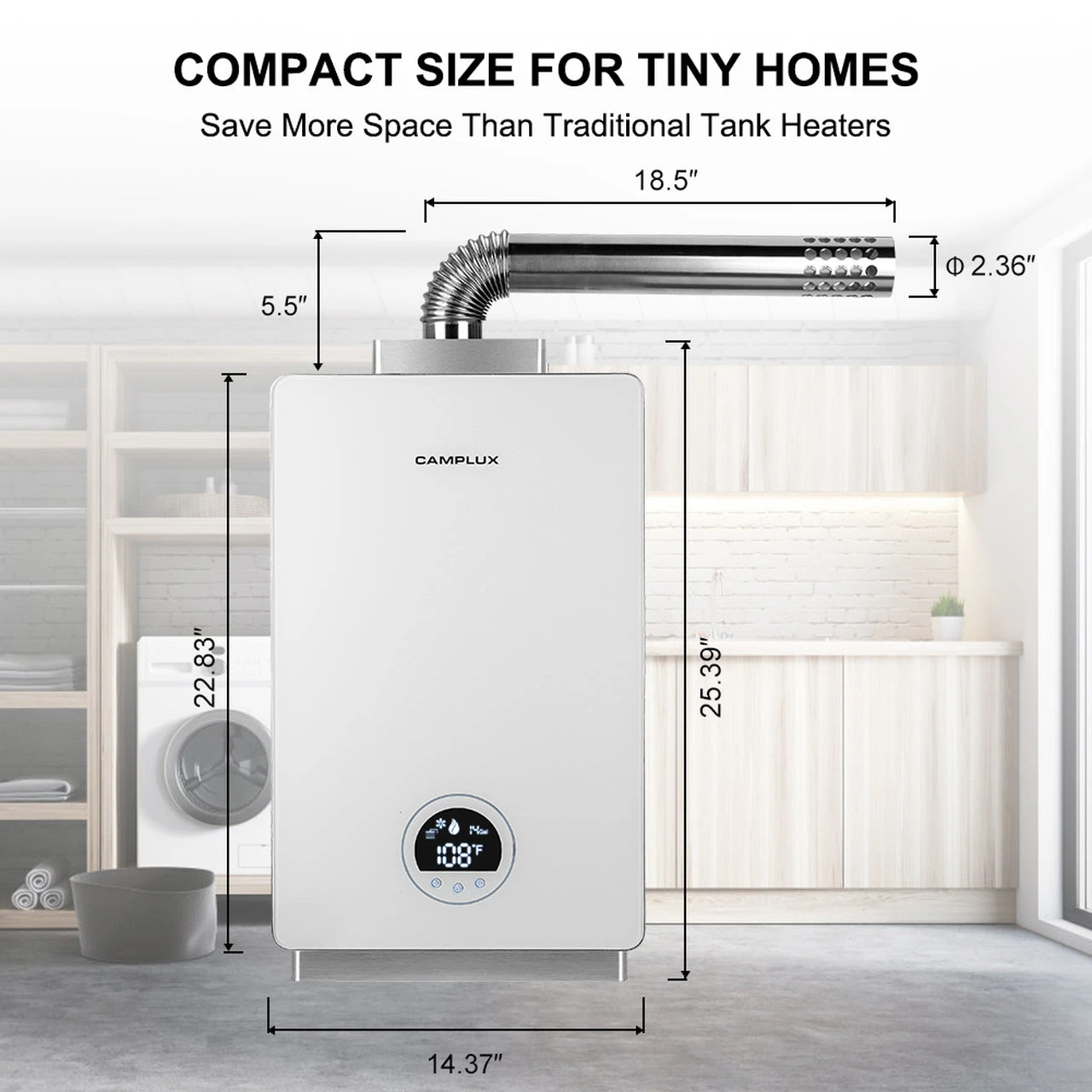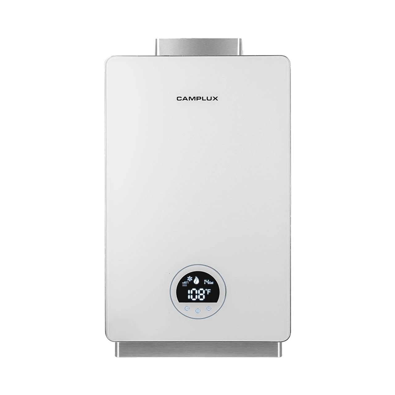 The Camplux 3.18ย GPM tankless water heater has a new revolutionary design, making it as the most unique tankless water heater on the market. This model features sleek black tempered glass panel, fully automatic temperature controls for precision, and a touch screen with an LED temperature display that shows output temperature and GPM flow. It equipped with child locking technology, itโs perfect for whole house use, apartment and small homes where you need more than one hot water application at the same time. Camplux water heater with innovative combustion technology and advanced multiple protection systems to ensure your safety.