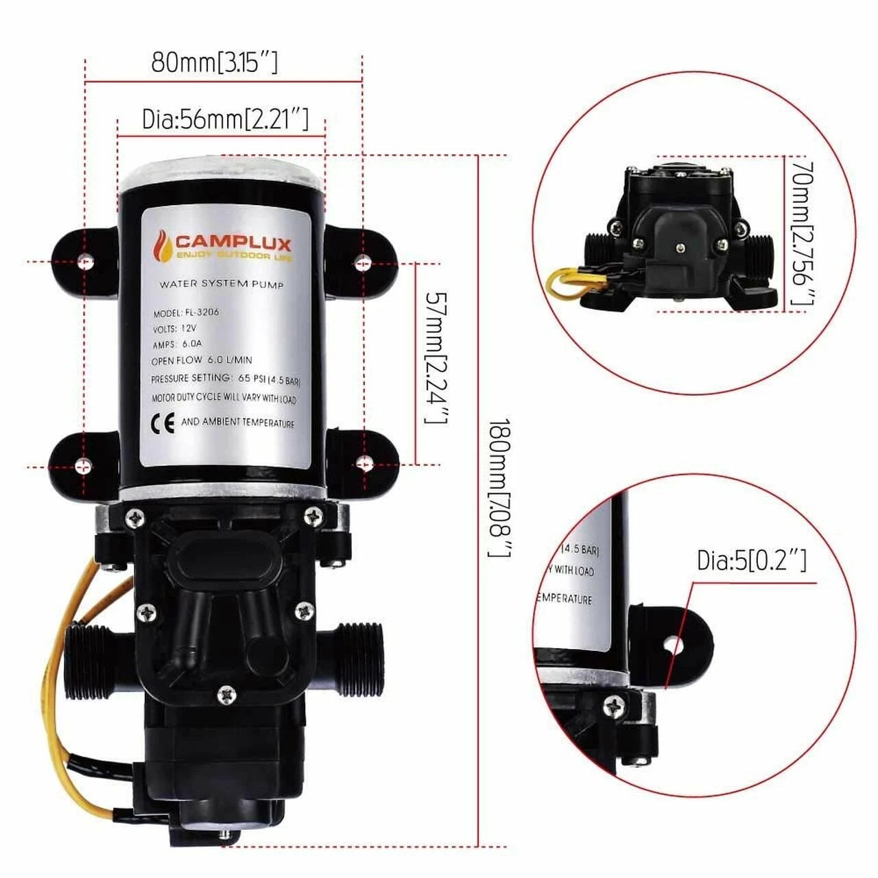 This little self-priming 12v diaphragm pressure pump is ideal for use in any area that requires water transfer. Allows for automatic pressurized water for RVโs, boats, and camping while doing dishes, taking showers, and other light duty purposes. The rubber mounting feet provide good vibration isolation. Compact and light weight, this pump is easy to install with a long lifespan.