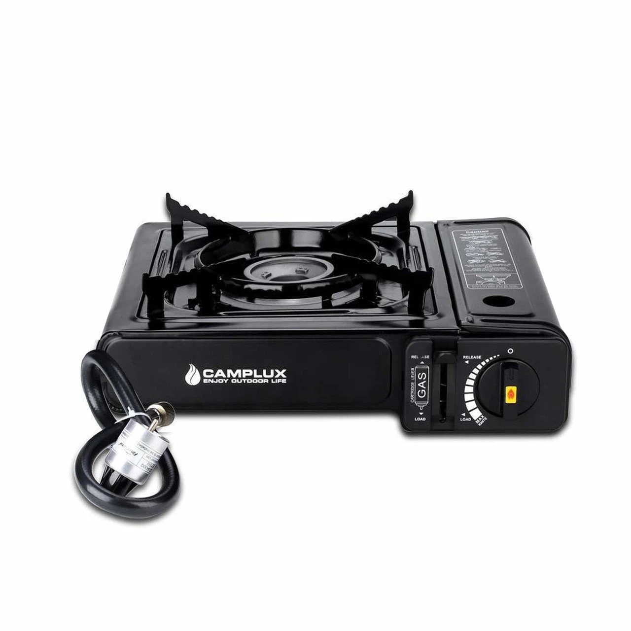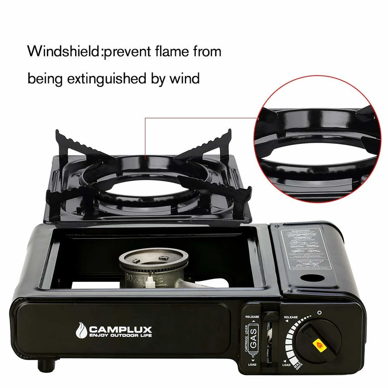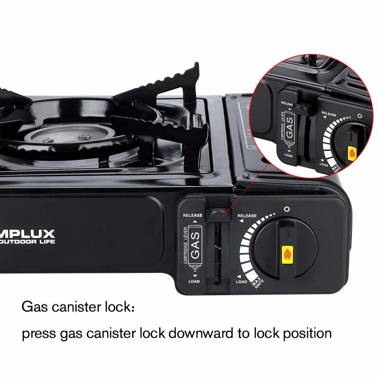 -Gas canister lock:press gas canister lock downward to lock position.