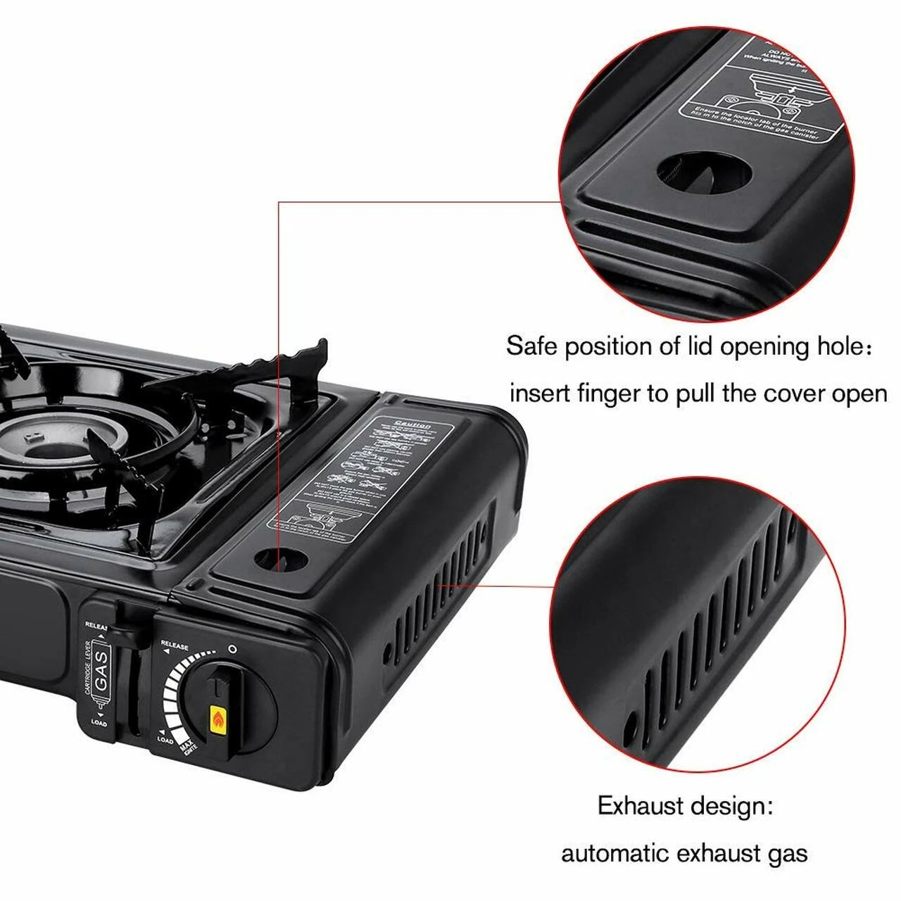 -Built safe position of lid opening hole:insert finger to pull hood open.