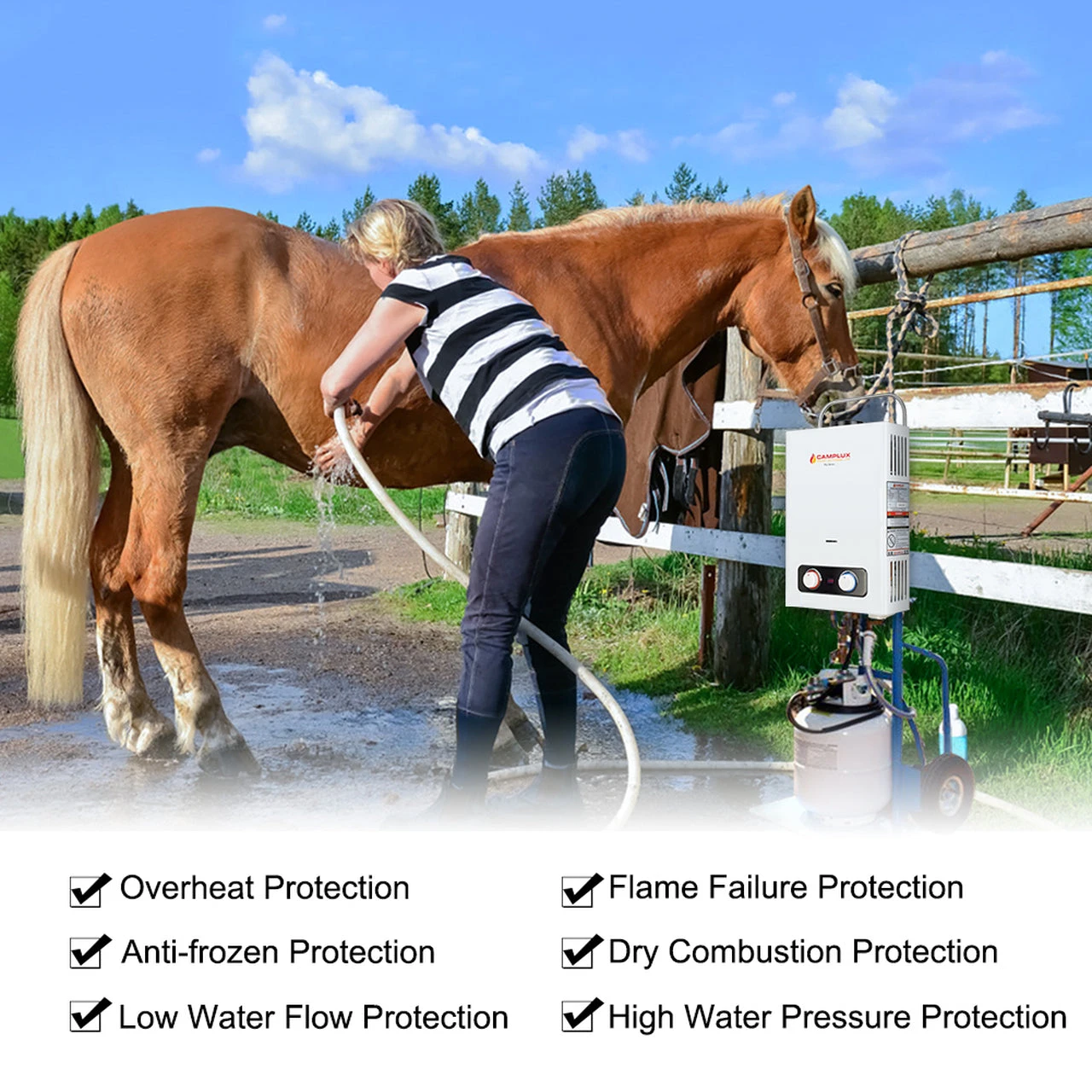The 1.58 GPM Camplux portable tankless water heater is perfect for campsites, cabins, or simply around the house. Wash your car, wash your boat, take a hot shower, wash the dogs or the horse. The ignition is with 2 D cell batteries so it makes it great for off grid or other areas where electricity is not readily available. The ideal operating range for the 1.58 GPM Camplux portable tankless water heater is 3.0~110.0 PSI .The system also works great on modified water systems such as a 12 volt pump (Camplux model number -JK-2202/JK-3206 ).Available in liquid propane only.