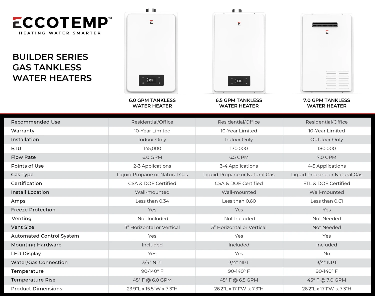 - Rated at 7 GPM (gallons per minute) at 180,000 BTUs with a temperature rise of 45 degrees, this ultra-efficient tankless hot water heater is the largest capacity model in the Eccotemp Builder Series and ideal for just about every size single-family home, townhome, condo, cabin, apartment, or light commercial use in the US and Canada