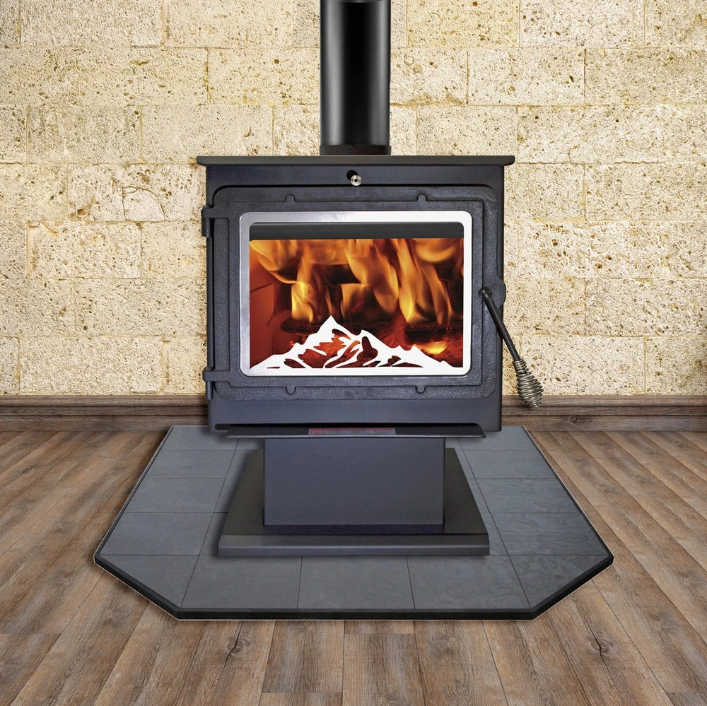 Integrated, wraparound heat shields offer safer operations, and more placement options and stylish, cool-touch spring handles accent the stoves’ classic style. The extra-large viewing glass gives a beautiful full view of the fire and we’ve included a decorative mountain scene door insert with this model to enhance the view even more (you can remove the insert, if desired). A free room air blower is included.
