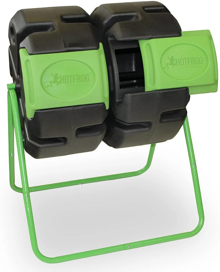 The FCMP Outdoor HOTFROG Dual Body Tumbling Composter is a hybrid of our two most popular composter models. Just like the design of our top selling IM4000 Dual Chamber Tumbling Composter there are 2 separate chambers allowing you to fill one side while the other side cures. Similar to our RM4000 “Roto” composter it is constructed of rugged UV resistant rotationally molded polyethylene and does not require assembly of the composter bodies. The HOTFROG Dual Body Tumbling Composter also features a corrosion resistant powder painted galvanized steel frame. The total volume of both chambers is approximately 37 gallons (5 cu ft).